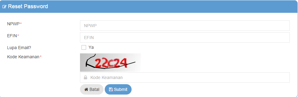 2. Masukan NPWP dan EFIN ke dalam kotak isian yang tersedia. Bila alamat email yang didaftarkan lupa, centang ya pada isian Lupa Email, bila tidak jangan di centang. Tulis kode keamanan yang terlihat dan klik submit.